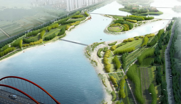 (1)滨河带:利用河流、河流沿岸的卵石和沙滩,设计水生植物、沙生植物、湿生植物以及树团营造滨河风貌,节点处开辟河滩活动场地。