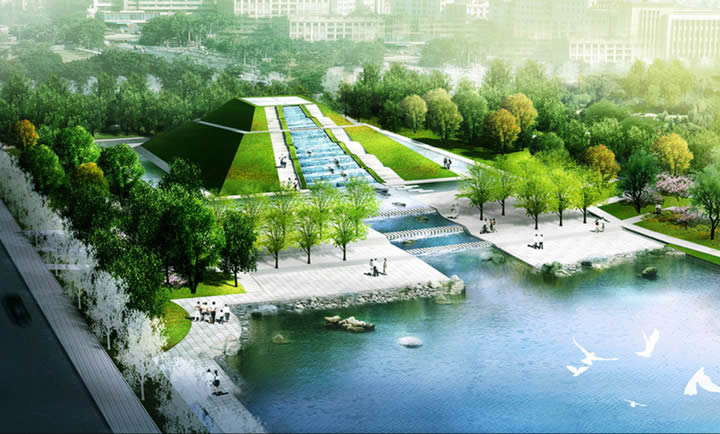 整条河滨绿地的设计以黄河流域地貌特征为依据,结合现有场地用地条件和状况,体现由于水的作用力形成的黄河两岸地形、土壤、植被、人文等特色景观,以及沿河两岸人类活动留下的人工痕迹,突出自然与人工痕迹交汇主题。设计根据区域(黄河三角洲)景观特色,结合现状情况和存在的问题,并在设计主题和设计原则的指导下,统筹考虑景观效果和使用功能,合理安排活动、停留空间,使水系两岸成为环境优美并能很好的满足市民、游客、周围工作人员活动的场所。