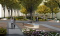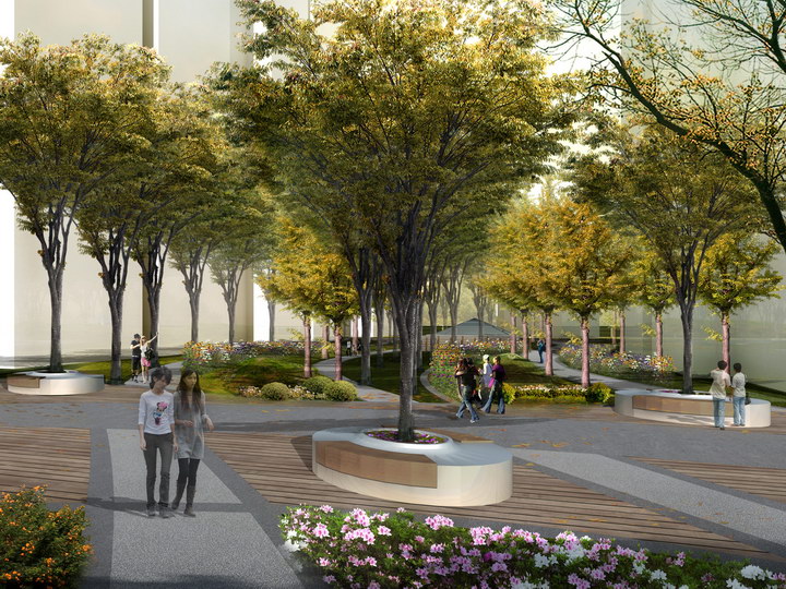 第二种该布局基本延续了场地入口广场与东侧的消防通道,并环绕通道两侧布置停留的休闲活动场地,其它区域处理成与通道走向相一致的条带状植物空间,使得活动空间与植物空间交融统一在一个完整的花园中。中心部分的花园保持相对的完整性,并设计若干微地形进行环线交通空间到中心花园的过渡。