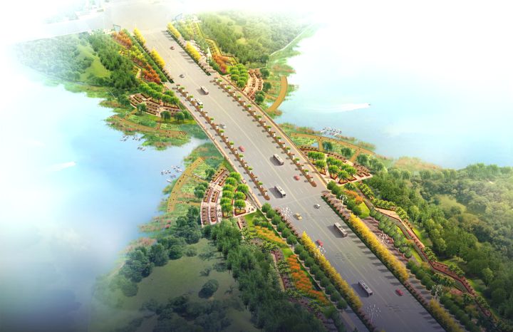 设计要求道路绿化符合行车视线和行车净空要求,满足树木对立地空间与生长空间的需要,适地适树并实行近远期结合。