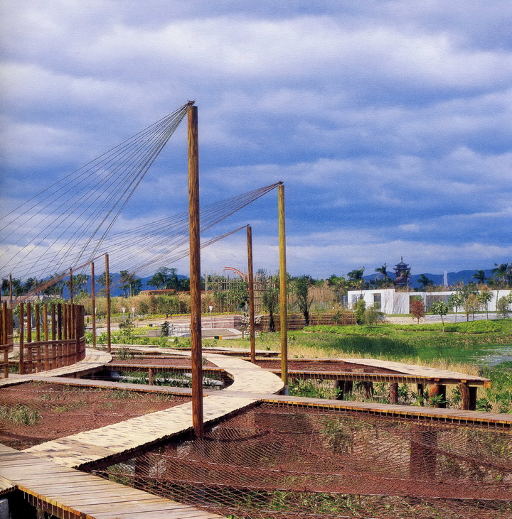 尽管场地面积有限,但适度的分隔更易于产生变化的空间效果。障景的设计采用两种手法,一是利用高大的水生植物,如芦苇、莎草、灯心草等构成的“实障”,在水、路、荫网这三个层面之间穿插,加强了空间的整体性;二是借鉴传统园林中的屏风,结合棕网构成的“虚障”,既起到框景的作用,同时为设计方案的文字解说提供了便利,类似传统园林中的铭刻。