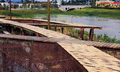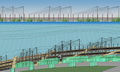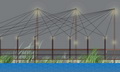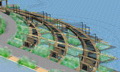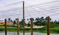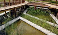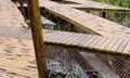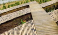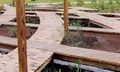“路网”是设在“水网”上方的架空层,也是游人活动的主要层面,体现出人与自然和谐的设计思想。设计以渔民赖以生存的渔船为原型,以竹木栈道形成纵横交错的路网,平面构图如同飘浮在水网上的船甲板。竹木栈道之间用棕绳编织出片片“渔网”,密织的部分可供游人漫步其间,体验漂浮在水面般的动感;疏织的部分有植物从缝间探出调皮的枝条,同时让游人透过棕网欣赏地面层的鱼群、水草和水面。