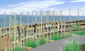 体现区域环境特征的元素,是围绕鱼塘的各种生物和活动,如鱼群、鸟类、芦荡、塘埂、渔网、小船等。由此构成的场景就是人们认识环境特征的要素。八号地已有的大片芦苇,虽给人留下了湿地的印象,但单一的景色还不足以反映原先那片“家园”的活力,还要通过“鱼塘”的引入,才能形成各种水生植物、鱼群、鸟类栖息的乐园;为了保护和欣赏这片乐土,需要引入“围网”的概念,并引申出“水网”、“路网”和遮挡烈日的“荫网”等设计元素;鸬鹚栖息的木桩兼有吸引远处游人到来的标识性作用。因此,设计主要围绕着“网”、“湿”、“园”这三个要素展开。