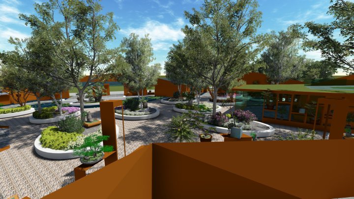 基地位于园博会西区,西临园区主路。该展园致力于将园子本身设计成一个“盆景”,在满足展览及游憩功能的同时,使得园子的整体景观给人以盆景的观感以及盆景中游历的空间体验,园中多样的游人活动反过来又构成了盆景的组成元素,盆景园因而成为“活的盆景园”。展园整体分为山水盆景区和树桩盆景区两个部分,树桩盆景展区由外至内划分有“巨型树桩盆景展示带”---“中小型盆景展示带”---“大型树桩盆景展区”,并在东北方向设置展示“珍贵盆景”和“微型盆景”的结合服务功能的建筑。