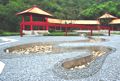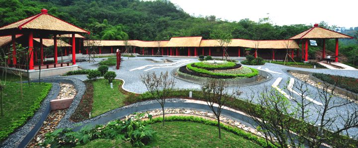 “安”:由“宀”和“女”组成,像妇女在家的形状,表示家中安定。以阙亭和长廊赋予“宀”实质内容,阙亭采用殷商风格,长廊用来展示汉文字发展演变历程;“女”以水系构成骨架,表现女子在家纺织的情景,仿照我国古代织布机推子的造型设计水帘墙,并在周边栽植棉麻类植物。